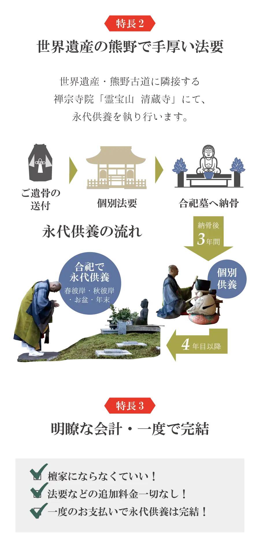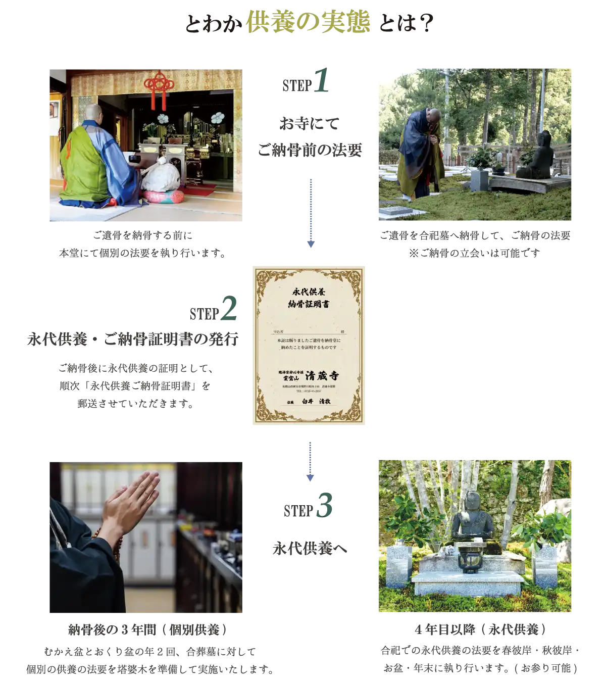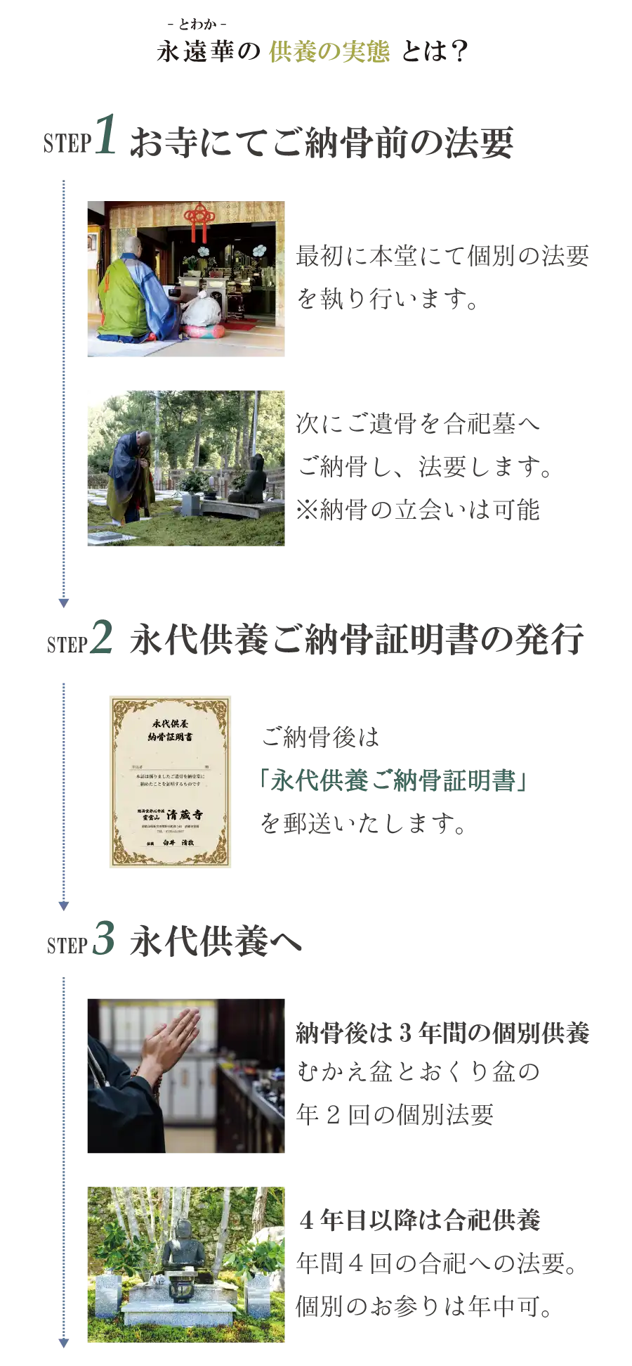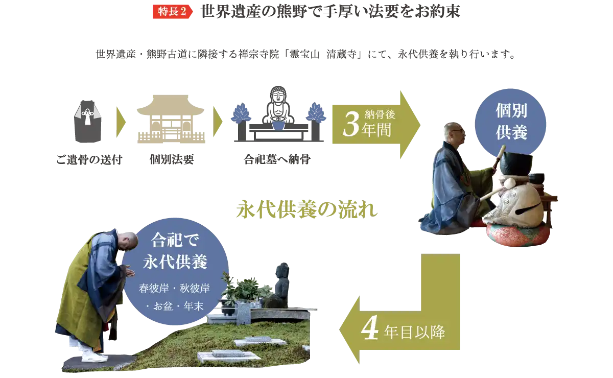 合祀墓への法要の後は、先3年間の迎え盆及び送り盆に故人様お一人おひとり個別の法要をいたします。 そのため、受け入れには限りがございます。 予めご了承ください