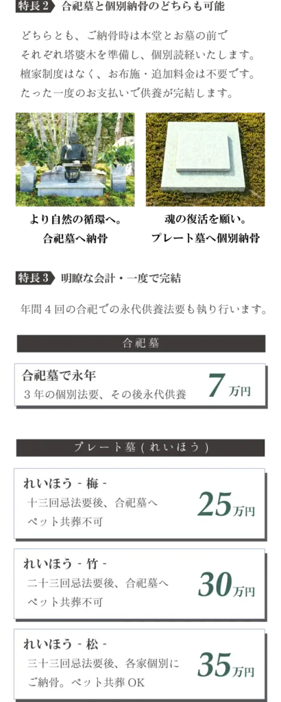 合祀墓・個別納骨のどちらも対応しております。